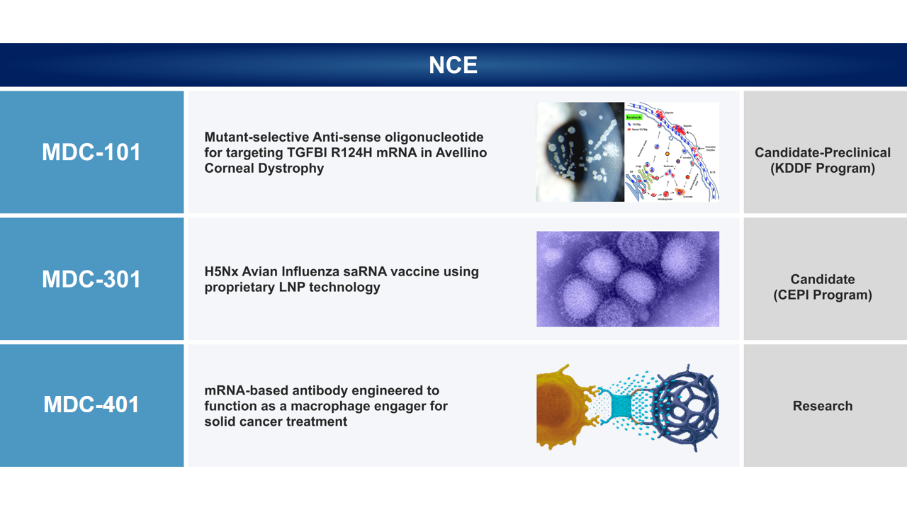 고병원성 조류인플루엔자(HPAI)는 Clade 2.3.4.4.b H5N1 및 H5Nx에 의해 발생하며, 전 세계 가금류 산업과 인류 건강에 심각한 위협이 되는 바이러스성 감염병입니다. MDC-301은 이러한 HPAI를 표적으로 개발된 mRNA 백신으로, cap 없이 자체 증폭이 가능한 self-amplifying mRNA 기술과 국소 전달형 LNP 플랫폼을 결합하여 기존 mRNA 백신 대비 효능과 안전성을 동시에 향상시켰습니다. 이 백신은 동물 모델에서 강력한 중화항체 반응을 유도하였고, 국소 전달 방식을 통해 전신 염증 부작용(reactogenicity)을 효과적으로 줄였습니다. 또한 RNA 및 LNP의 핵심 구성요소에 대해 독점 특허를 확보하고 있으며, Cap 및 modified uridine과 같은 고가 원료를 사용하지 않아 생산 비용 측면에서 매우 우수한 효율성을 가집니다.